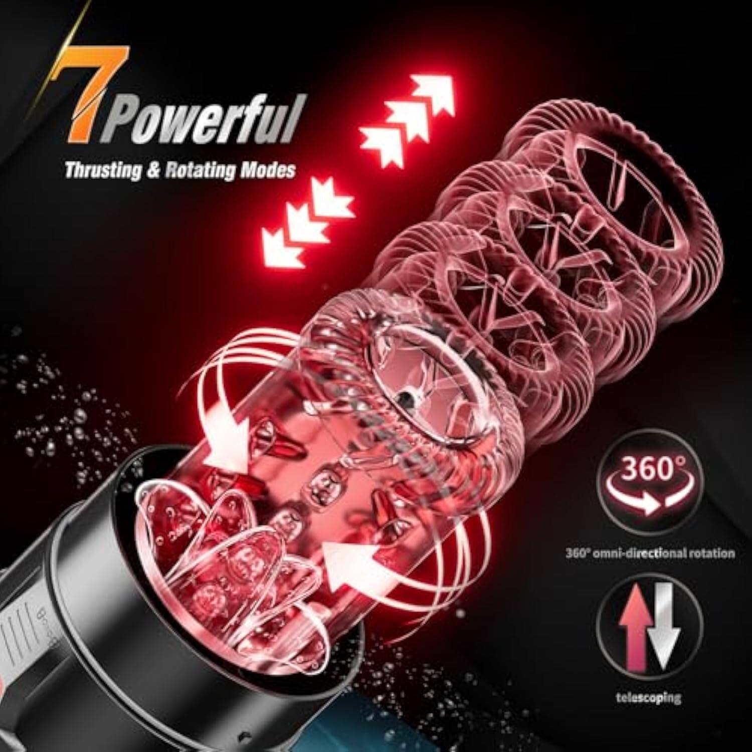 Integrates six functions in one. This male sex toy has 7 thrusts, 7 rotations, 7 suctions, 7 vibrations and a 12-second penis pump, integrated with the LCD screen. In addition, this adult toy is equipped with a soft and red 3D enhanced transparent sleeve